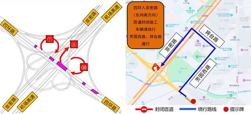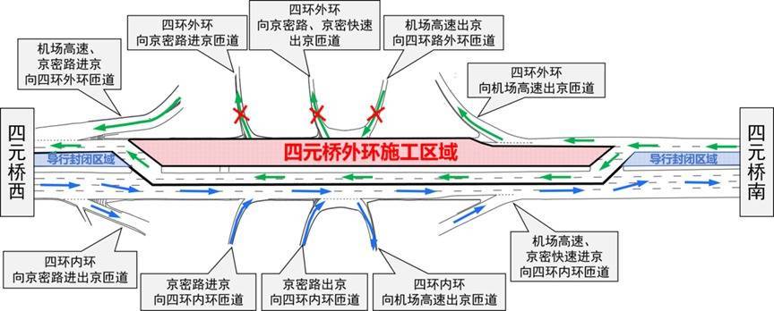 r4月25日0时至5时四环主路将实施对向交通导行工作,请过往车辆提前绕行;4月25日5时至4月26日24时实现“分幅占路、对向导行”,届时外环车辆在四元桥区导入对向(内环)行驶。期间,内环匝道不受影响,封闭外环受影响的3条匝道:四环外环向京密路进京匝道、四环外环向京密路出京匝道、机场高速出京向四环外环匝道。