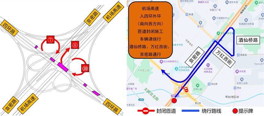 r绕行路线:在机场高速出京方向四元桥西设置提示标志,提示车辆沿机场高速向北→酒仙桥路出口驶出→酒仙桥路→万红西街→京密路→四环外环(绕行距离5.1km)
