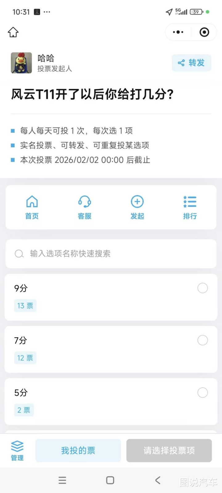 从老图的粉丝群来看,27个人参与投票,给风云T11驾驶感受打9分的,有13个人,虽然样本不算丰富,至少也有近半的人给到风云T11这么高的评价,说明它还是有点自己的独特之处。