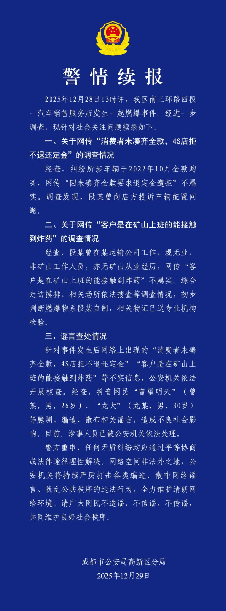 新京报讯12月29日,成都高新警方再通报“4S店外燃爆事故”,初步判断燃爆物系自制,另外针对谣言,已查处2名造谣者。据警方此前通报,该事故已造成1死4伤。以下为全文: